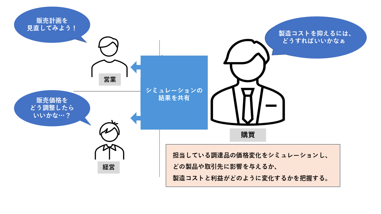 購入品、外注契約、労務費管理など、各担当の部門から共有されたシミュレーション結果を通して、自社にどれくらいの影響が出るのか把握できます。