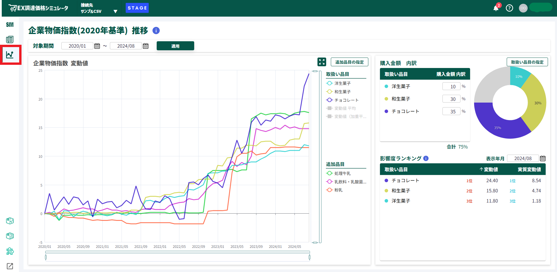 自社で主に購入している品目の、一般的な価格動向を確認することができます。