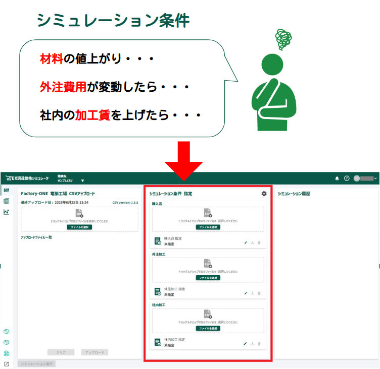 Factory-ONE 電脳工場から出力したCSV(またはサンプルCSV)のアップロード後、シミュレーション条件を指定します。