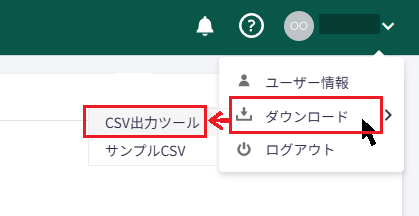 画面右上のID表示部分をクリックし、「ダウンロード > CSV出力ツール」を選択すると、zipファイルがダウンロードされます。