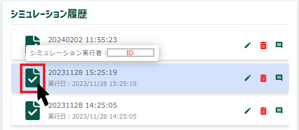 下図の赤枠で囲まれているアイコンにマウスを当てると、過去に誰がシミュレーションを実行したか確認できます。
