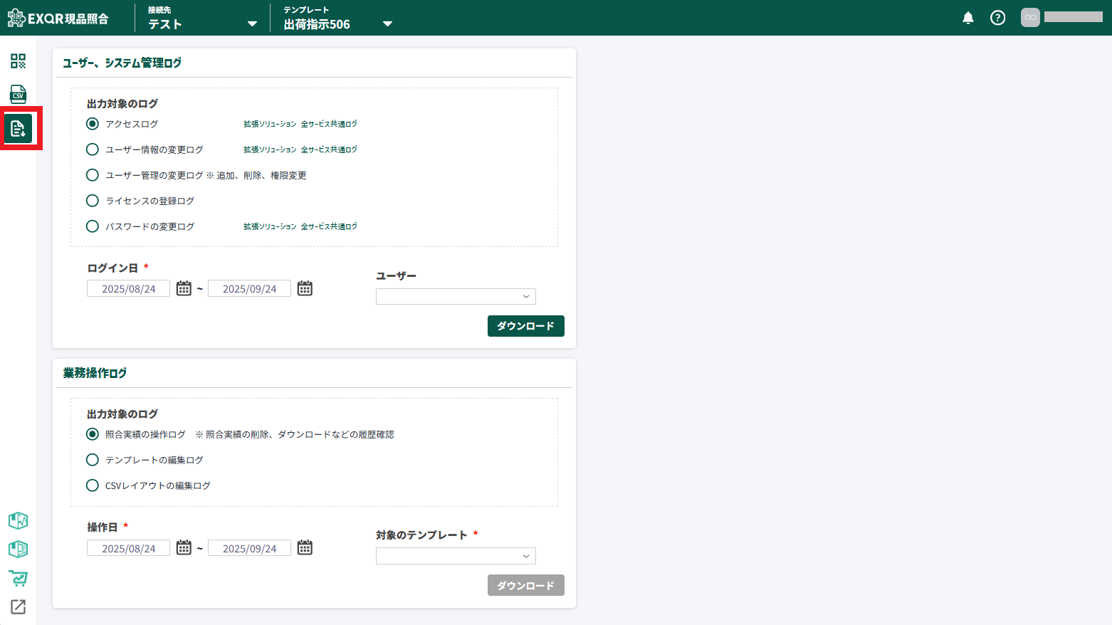 ※契約者 または 管理者権限を持つユーザーのみ、ログ情報を出力できます。