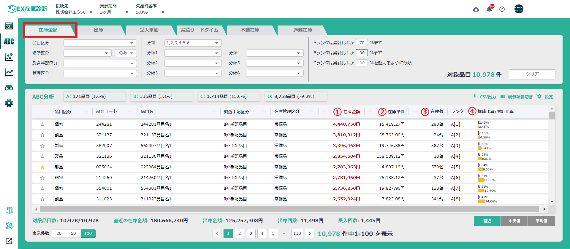 • 在庫金額の累計比率の計算方法はこちらをご参照ください。