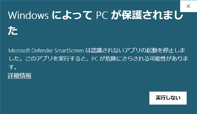 - exeファイルの実行時に下の図のようなポップアップが表示されることがあります。