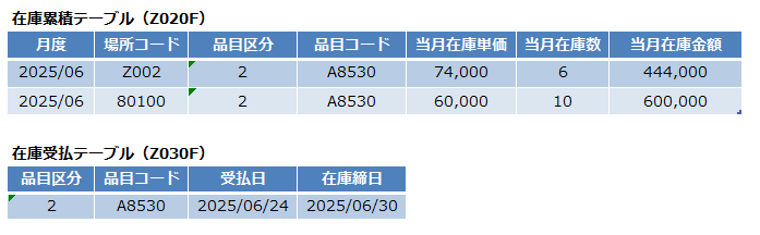2025年6月時点で、品目区分=2 品目コード=”A8530″ である品目は、”Z002″と”80100″という異なる場所に存在しています。