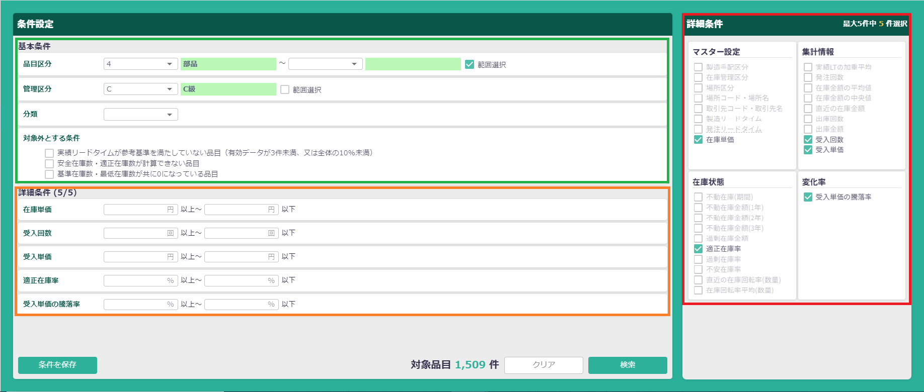 基本条件(緑枠)の項目は固定ですが、詳細条件の項目は最大5件まで自由に選択する可能です。