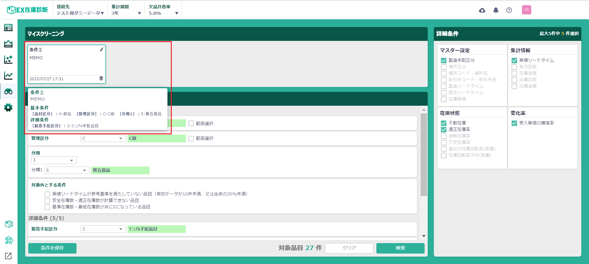 保存された条件は画面の上部にカード形で表示されます。条件のカードにマウスホバーすると、ポップアップで基本条件と詳細条件を確認することができます。